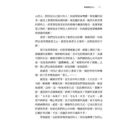 《風俗通》裡邰子擊壤的句子這樣說:「每日清晨一炷香,謝天謝地謝三光。」在吳稼祥的《把海水倒進杯子》裡曾經寫道:「上帝其實很公平,祂給富人以好食物,給窮人以好胃口;給大人物以矮小的身軀,給偉岸者以卑微的靈魂;給馥郁的桂花以可憐的形貌,給不芬芳的牡丹以天仙的姿色;讓惡人得到詛咒,但用享樂補償;讓善人獲得讚美,但用痛苦折磨;讓強大者獨處,讓弱小者群居;給無爪牙者以翅膀,給不能飛翔者以爪牙……。祂不讓任何東西完美,於是,人類才有了對完美的渴望。」祂給你這麼多,也一定會拿走這麼多。你所擁有的,都是必須感恩的。想通了,就感到周身舒坦,惶恐和浮躁便會隨風遠去。