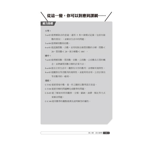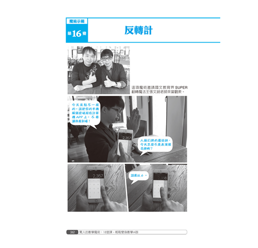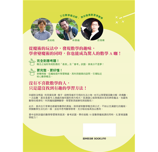 此外,食衣住行育樂也都藏有數學的奧秘。與其硬背數學概念與公式,不如以充滿變化的魔術,突顯數學生活化的一面,並從中思考數學原理,充分吸收後再加以應用。