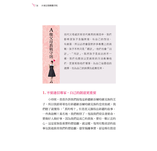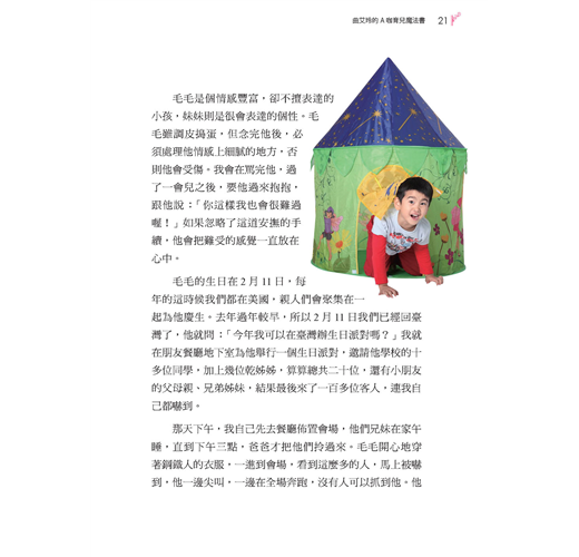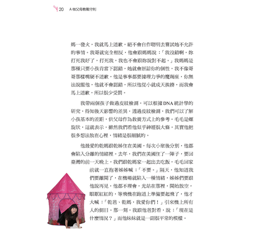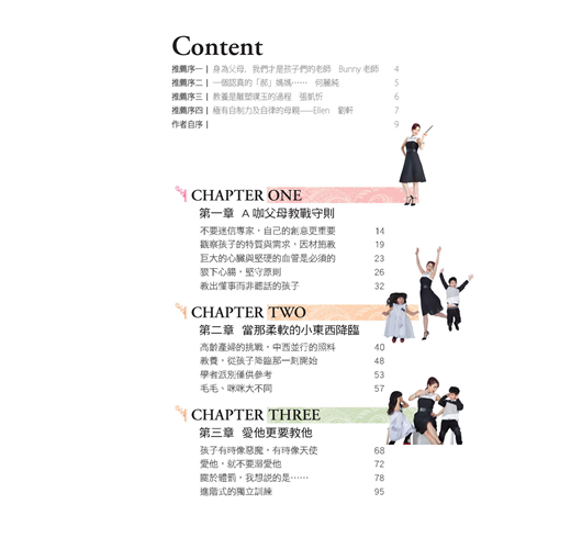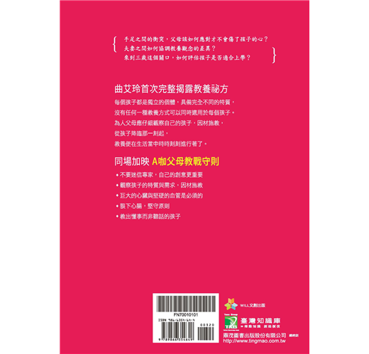 有「活動女王」之稱的曲艾玲,無論工作再忙碌,也絕不將養兒育女的工作假手他人。對於一雙兒女——毛毛和咪咪——的照顧與教養,她有自己的獨特祕方,不落入一般教養迷思,也不迷信專家。曲艾玲將於本書與大家分享「A咖父母教戰守則」,首次完整揭露自己如何發揮創意,教出懂事而非聽話的孩子。