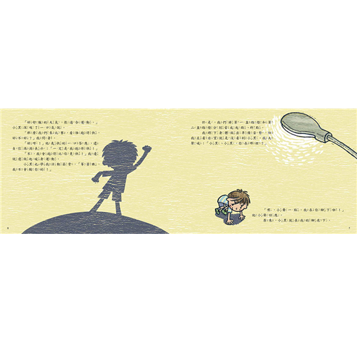在故事中,作者將主角小男孩的影子,化身為形影不離的好朋友「小黑」,透過某個夜晚,兩人在公園裡比賽跑,小黑的表現與其身影在路燈下忽前忽後、忽濃忽淡,生動的描繪出「光」和「影」之間的關係。