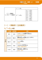「文字、語彙」細分為和語篇及音讀漢字篇,不僅用音節數及按五十音分門別類,相似動詞中還加上例句,讓您能在最短時間內,分辨單字間的不同,進而抓住快速解題的訣竅!「和語篇」分成七部分,分別為一、訓讀名詞,二、和語動詞,三、複合動詞,四、形容詞,五、副詞,六、外來語,七、接續詞,幫助讀者平日背誦以及考前總複習,只要記住這些語彙,不僅「文字‧語彙」相關考題可以拿到滿分,亦有助於理解「讀解」之文章。請搭配MP3學習,效果更佳。