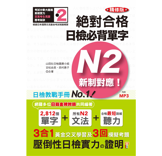 史上最強的新日檢N2單字集《精修版 新制對應 絕對合格!日檢必背單字N2》,是根據日本國際交流基金(JAPAN FOUNDATION)舊制考試基準及新發表的「新日本語能力試驗相關概要」,加以編寫彙整而成的。除此之外,並精心分析從2010年開始的最新日檢考試內容,增加了過去未收錄的N2程度常用單字,接近300字,也據此調整了單字的程度,可說是內容最紮實N2單字書。無論是累積應考實力,或是考前迅速總複習,都是您高分合格最佳利器。