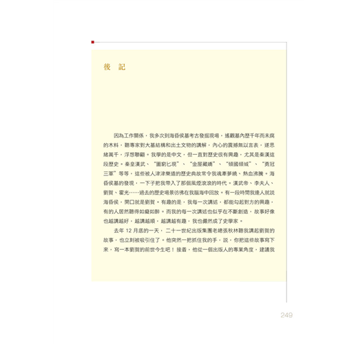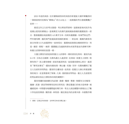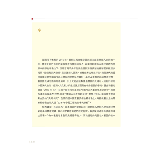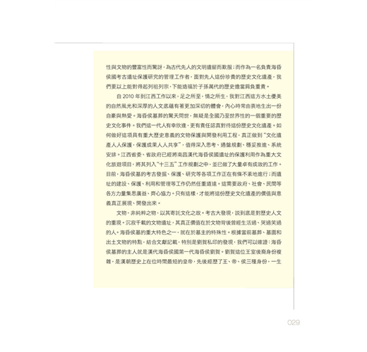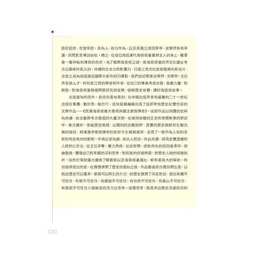 啟示,更是對當下為政為人的理性警醒。劉賀所生活的風雲際會的漢代,早已成為遙遠的歷史;而歷史大背景下其人物傳奇命運所折射出的為政之道、人生哲理等豐富內涵,卻歷久彌新,值得後人一再品味。史家常說,一切歷史都是當代史。站在海昏侯遺址前,遙想劉賀的前世今生,作者作出這樣別出心裁的解讀與思考,足以說明,這不僅是一本有助讀興、促進旅遊文化發展的尋常圖書,也是一部稱得上嚴肅認真、發人深思的史家著作了。我期待這本書既能在廣大讀者中叫座,又能在文學界叫好。同時,隨著海昏侯墓考古發現的深入,隨之而來的出版資源將源源不斷地呈現出來。傳承優秀文化遺產,打造新的歷史文化名片,包括二十一世紀出版社集團在內的江西出版人責無旁貸。藉這本書問世的機會,我們期待有更多更好的海昏侯主題圖書湧現出來,推動江西的歷史文化遺產保護與開發工作,更上層樓。