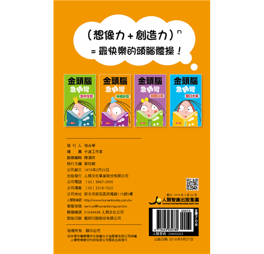 1、輕鬆幽默的頭腦體操,跳脫僵化制式的思考,激發孩子豐富的想像力和大膽的創意。2、將文字結合活潑搞笑的漫畫插圖,增添閱讀的趣味性。3、互動式問答設計,是孩子們彼此激盪創意、加強應答能力的雙向語文益智遊戲。