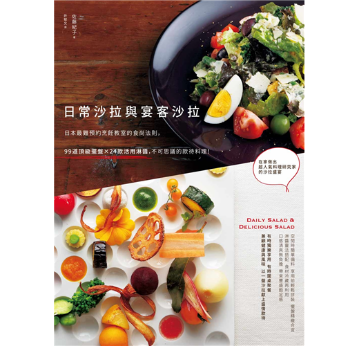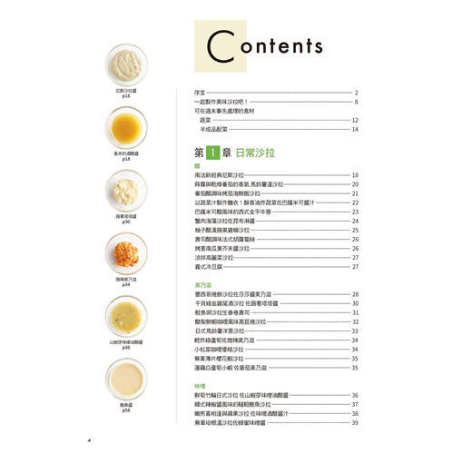 本書分成「日常沙拉」與「宴客沙拉」兩大單元。在「日常沙拉」的內容裡,以單盤沙拉作為主角,在蔬菜大量加入肉與魚等蛋白質,讓人們從一盤沙拉之中攝取足夠的營養。淋醬的基底則是以冰箱既有的美乃滋、酸橘醋,以及常見的調味料調和而成,獨自享用的日常沙拉,取悅自己的味蕾,簡單中也有樂趣。
