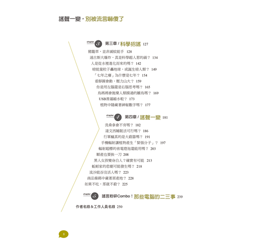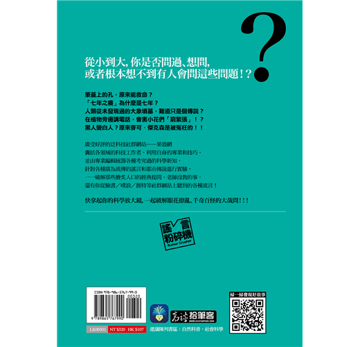 《謠言粉碎機》系列書深入探究動植物、人體、健康議題及科技產品等領域,解答最奇怪的問題、口耳相傳的謠言,和無法解釋的生活現象。如果你想進一步瞭解科學問題、增加人際交流話題、更聰明的生活,這本書你非讀不可!