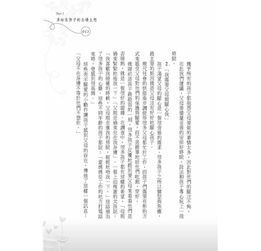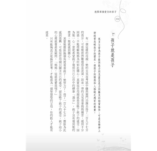 其實她應該換個角度看看孩子:她努力了,得了一百九十七分,應該為此感到高興。可是這位母親只關注自己的感受,卻忽略了孩子的感受,孩子幼小的心裡就會產生疑問:「媽媽,這就是愛我嗎?」