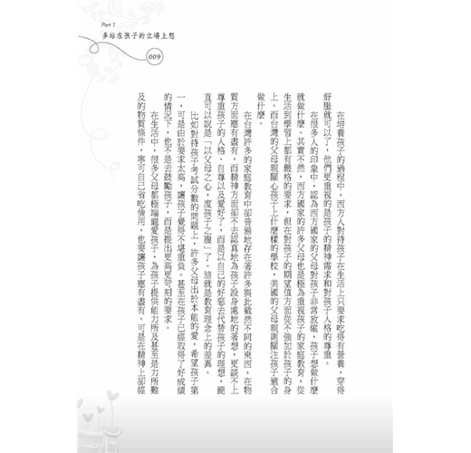 在台灣許多的家庭教育中卻普遍地存在著許多與此截然不同的東西,在物質方面應有盡有,而精神方面卻不去認真地為孩子設身處地的著想,更談不上尊重孩子的人格、自尊以及愛好了,而是以自己的好惡去代替孩子的理想,簡直可以說是「以父母之心,度孩子之腹」了。這就是教育理念上的差異。