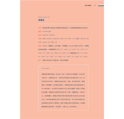 時至今日,當各個城市努力尋找足以吸引世界目光的賣點,西安早已憑著第八大奇蹟―兵馬俑馳名全球,其餘動輒千年起跳的陵墓、寶塔、寺廟、遺址不及備載,置身其中,堪稱步步是歷史、處處是古蹟。「訪了武媚娘(乾陵)便無閒探唐太宗(昭陵),見了王寶釧(寒窯)就得棄秦二世(胡亥墓),選擇登華山論劍則無暇一睹佛指舍利(法門寺)。」景點清一色資歷顯赫,去與不去都是煎熬,如此高規格的取捨,也唯獨在如此有本事的西安才可能發生。