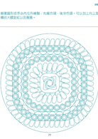 無論是何種類型的曼陀羅,為了概括整體圖案的構成,都應先從中間的部分開始著色。一切從中間開始,也與中間保持和諧的關係。這樣的進行,不僅帶來完整且連續的作品,也在繪製結束後,迎來滿足的喜悅。