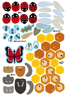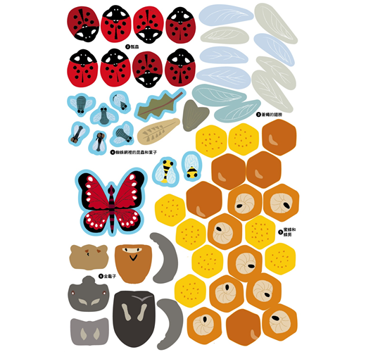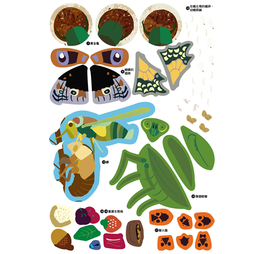 用貼紙來完成許多昆蟲和蝴蝶,還能將毛毛蟲跟螢火蟲盡情著色,完成自己的生態箱喔!