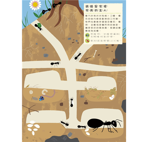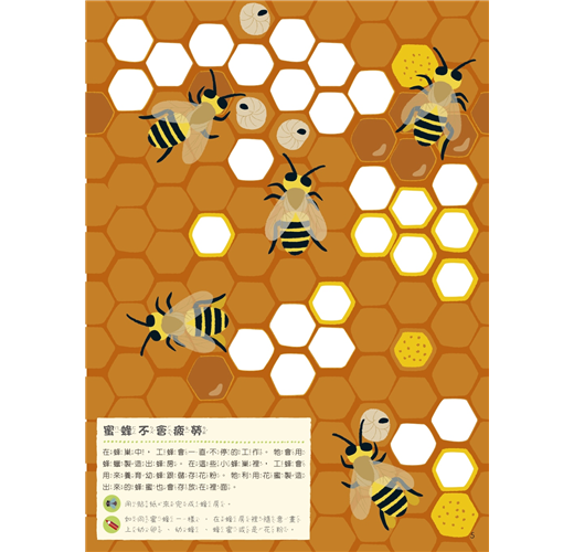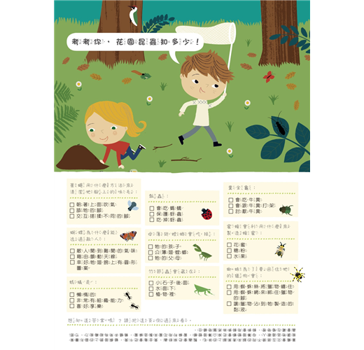 除了遊戲外,每個跨頁提供了許多與昆蟲息息相關的知識,讓孩子更加了解花園昆蟲的生態,比如:瓢蟲吃什麼?蜜蜂會利用什麼來製造蜂蜜?毛毛蟲長大後會變成什麼?竹節蟲藏在哪裡?蜘蛛為了要困住獵物會怎麼做?許多令人興奮的昆蟲大小事,都藏在書裡。爸媽趕快跟孩子協力完成專屬於你們的花園昆蟲繪本,並且試試看能否通過書中興味盎然的科普知識小測驗吧!