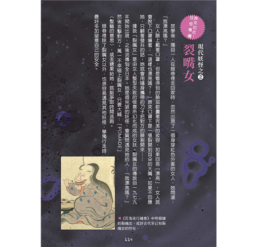 本書除了蒐集世界各地近90種妖怪及幻獸事蹟,還介紹裂嘴女、廁所的花子、半身死靈等
