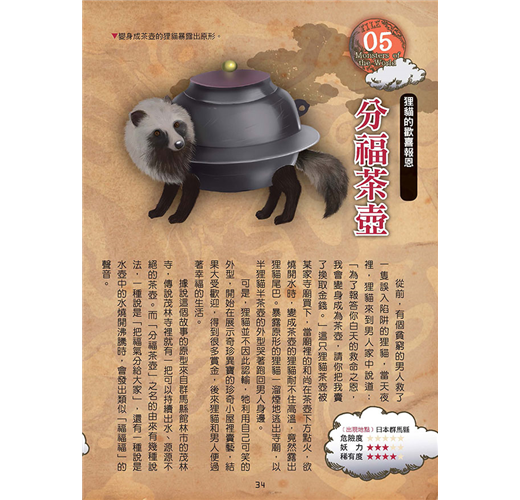 說明妖怪形成的原因、出現的時間與徵兆、具有的法力以及行動的特色等,針對這些特點,找出破解妖怪騷擾的方法,讓你順利地從險境中逃脫。