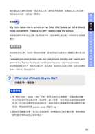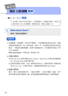 口說部分的「複誦」篇教你怎麼聽題目與如何分段記憶,以及發音上的重點;「朗讀句子與短文」篇告訴你在朗讀時要如何斷句、強調重音與控制語調;在「回答問題」中,一開始會先提到題目重點,並告訴你怎麼去聯想你的表達,接著列出可能的回答,讓你在聽到題目時不慌不忙,馬上就有應變的回答方式。