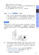 在本書中,寫作部分的「單句寫作」篇會針對題目重點、文法、如何快速解題來分析,讓你一看就知道在考什麼,讓你在做句子改寫、句子合併、重組時,能愈寫愈順。而「段落作文」篇會從如何看圖教起,學會如何分析圖片,如何看圖來聯想表達,並根據個別的圖片列出可用的句子,最後再組織成一篇文章。
