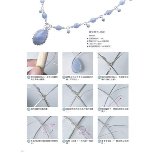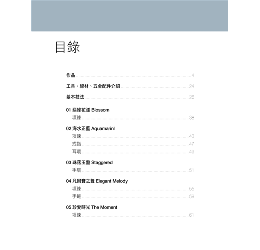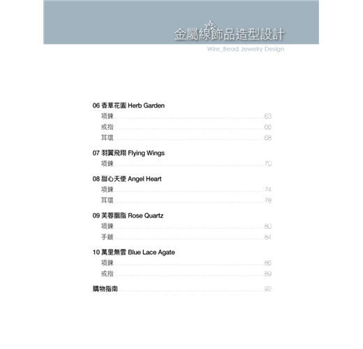 本書呈現Mia老師設計的10組用金屬線編織成的作品,以step by step的方式教大家製作這些精緻、有質感的美麗飾品,包括項鍊、戒指、耳環、手環、手鏈等。