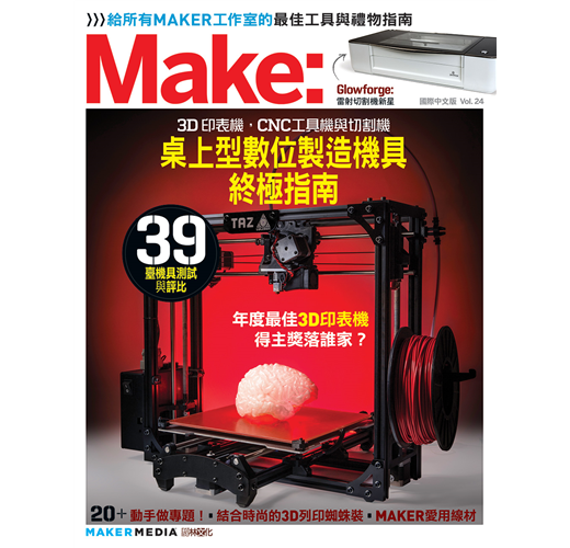 說到使用工具,就不能不提到這一期《MAKE》的年度3D印表機評比專題。在這一次的專題當中,我們將十幾位3D列印與生產製造的專家聚集在一起,用一個週末的時間,一同評比出本年度最棒的3D製造工具。除了熱熔融沉積型3D印表機外,在今年我們首次將迷你CNC銑床和雷射切割機納入專題中,還有我最愛的3D 製造商Printrbot所出品的大型雕刻機 Crawlbot,這一款機器可以在4×8的合板上來去自如,將傢俱零件「印」出來!