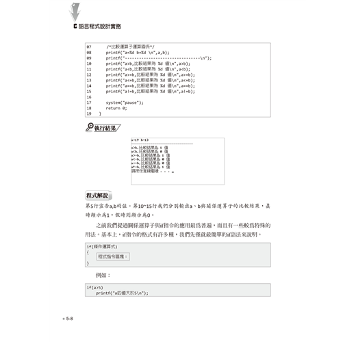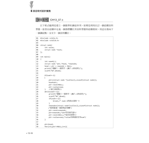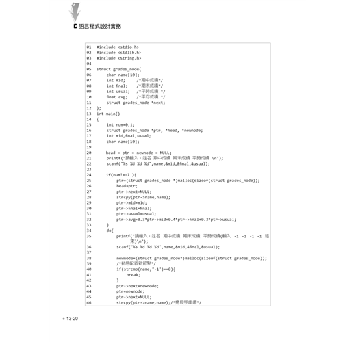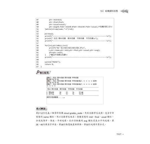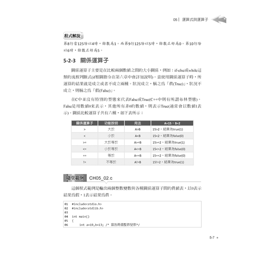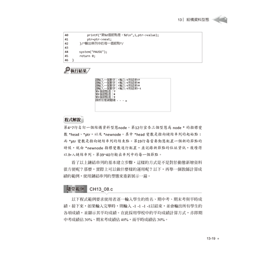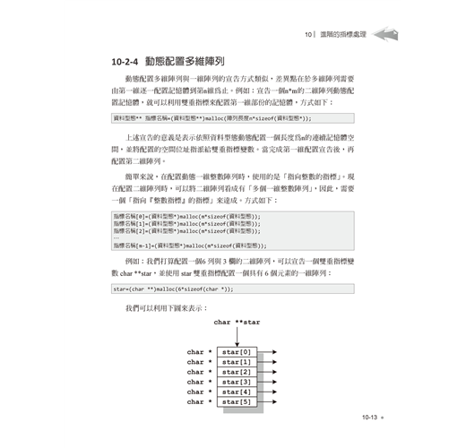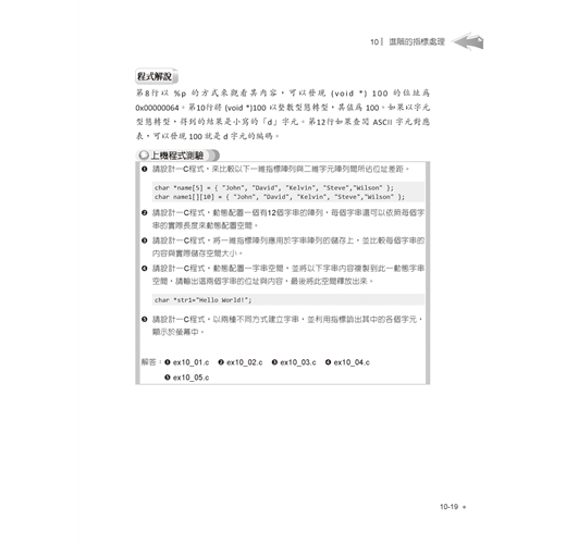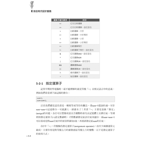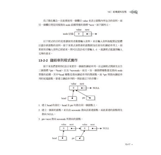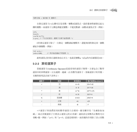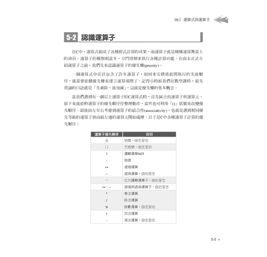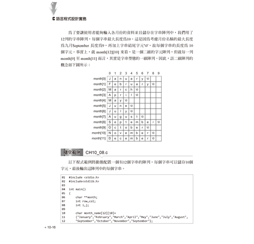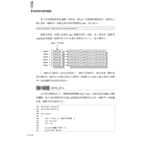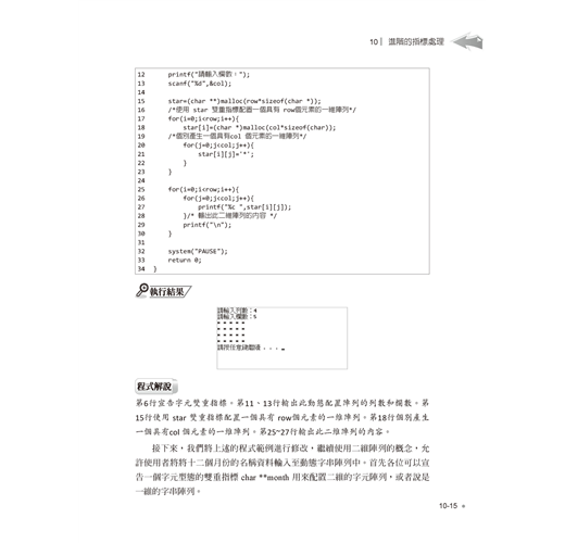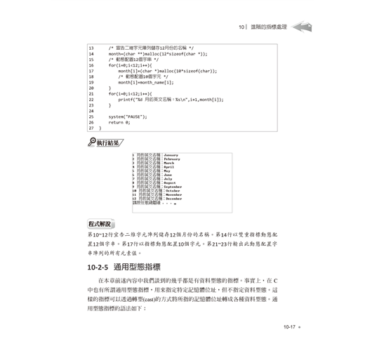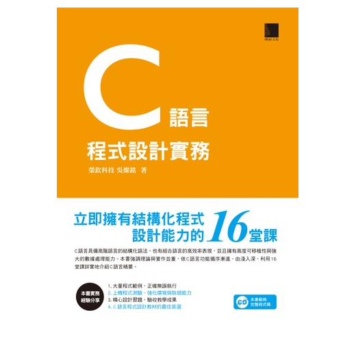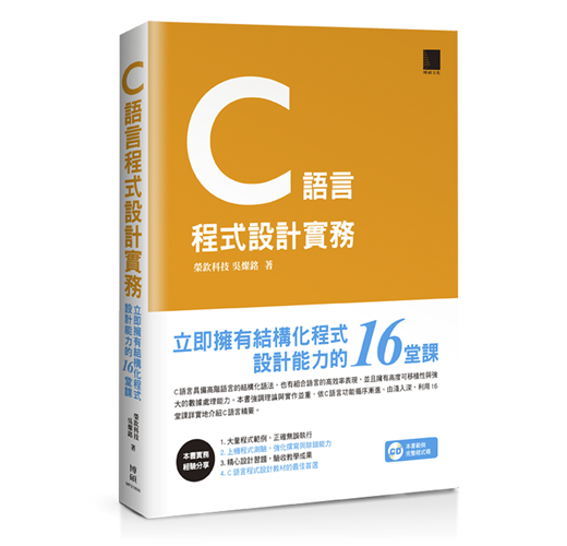 進階語法單元則包括陣列與字串的宣告與綜合運用,再介紹指標與位址的觀念與實作,並示範如何自訂函數、參數傳遞與函數進階應用,最後則提到前置處理指令與巨集。