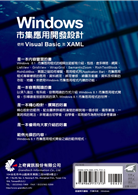 本書包含的主題: 認識XAML 語言、如何控制使用者介面的畫面配置(Layout)、事件的操作、控制項的應用(含多媒體、網頁、ListView、GridView、WrapGrid、SemanticZoom、RichTextBlock、RichEditBox、頁面之間如何導覽、應用程式列(Application Bar)、市集應用程式專案樣版的應用)、資料綁定、綁定樣版、繪圖及動畫、資料及檔案的存取、地圖,來使用Windows 市集應用程式內建的功能。