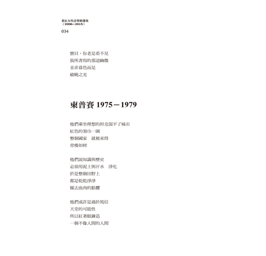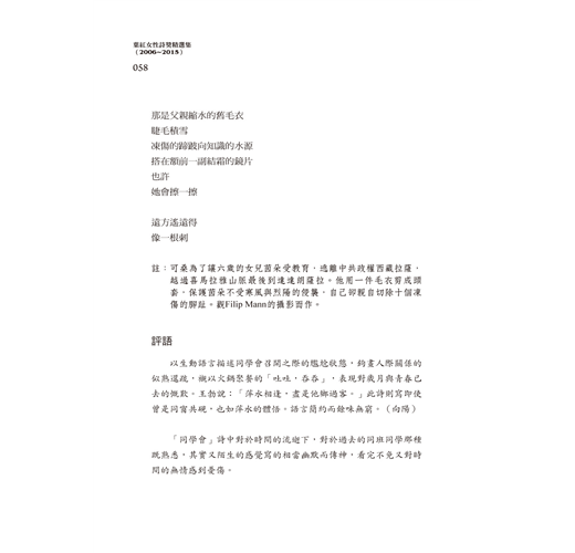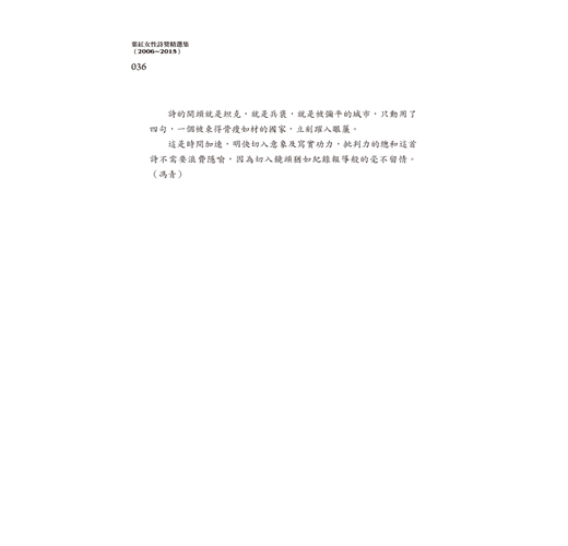 來自世界各地優秀的華文女詩人,於此凝聚並展示女性婉轉幽微的心聲、細膩令人窒息的觀察、以及世界另一半人口永遠難以詮解的脾性。
