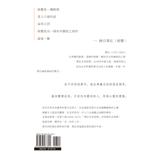 本書收錄第一至第十屆(2006-2015)「葉紅女性詩獎」的得獎作品精華,每屆首獎、優等各一名,佳作六名。書末併附葉紅精彩詩作選、葉紅評論選及葉紅創作年表。