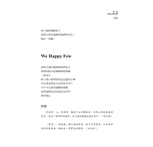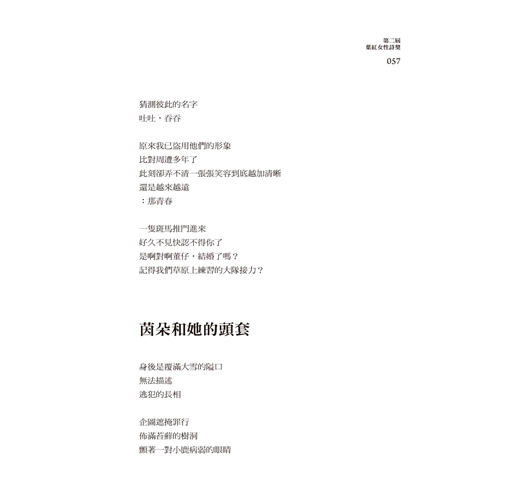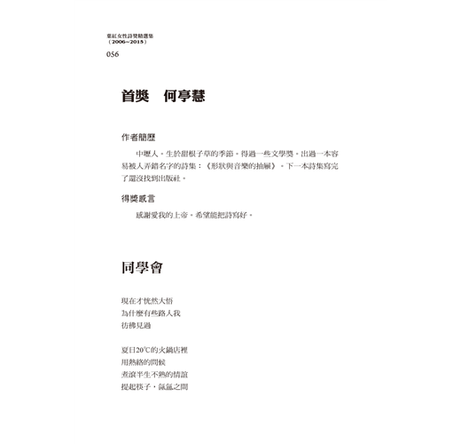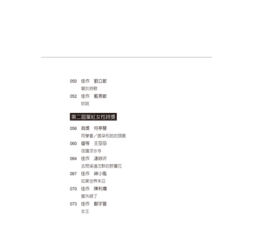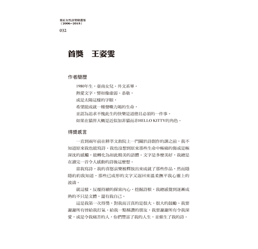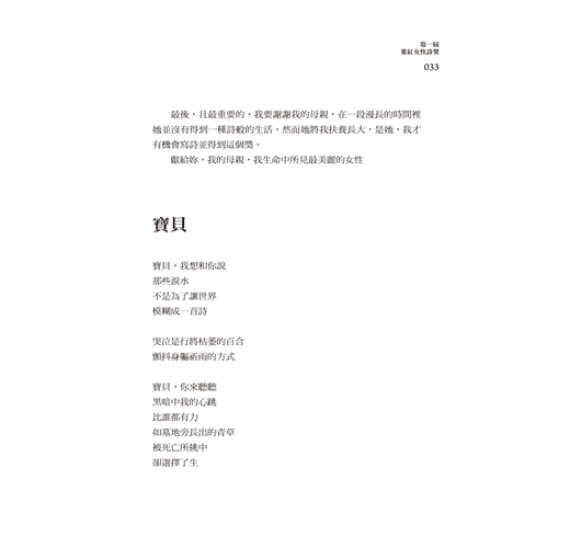 在千百的詩獎中,發出專屬女性的高音頻率,讓身體潛在的、只有內耳聽到的人,同感心靈的震動。