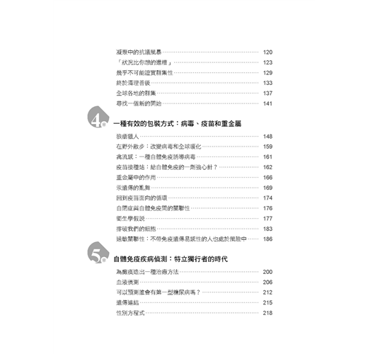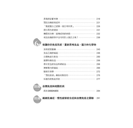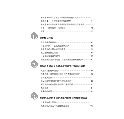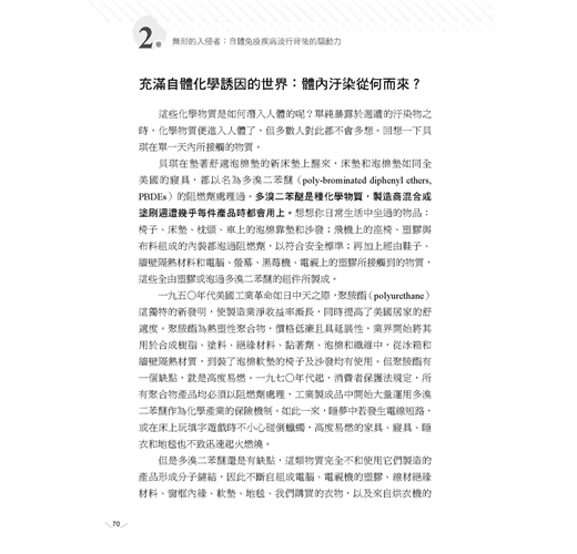 2. 詳列目前所知大部分和自體免疫系統有關的疾病,以及日常生活中該避免的化學毒物,並提出預防之方,敦促你注意和採取行動,找回自身與環境間的健康平衡。