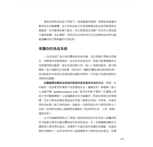 中澤小姐介紹了一個專有名詞「自體化學誘因」(autogen),用來描述自體免疫疾病的化學誘因,然後用「致癌物」(carcinogen)表示引發癌症的化學誘因。「自體化學誘因」這個專有名詞應該要成為我們社會字庫的一部分,請從本書開始,將它作為實踐改變的號召。想改變就要同時從個人責任與社會變革著手,公司應該確立化學品對自體免疫性疾病與癌症發展的影響,法律更要強制企業執行這件事。本書會激發你想要採取行動保護自己與心愛的人,採取行動讓自己在環境與身體間找回健康的平衡。