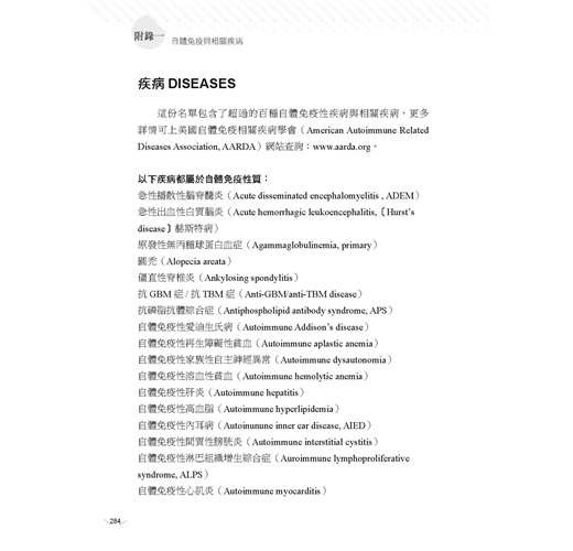 自體免疫疾病的種類超過一百二十種,其直接引爆因子為「免疫系統對自己體內的正常細胞、組織,或器官自我耐受性崩潰,而加以攻擊」所致,但其上游的致病影響因子,則是遺傳、調控遺傳因素,以及周邊眾多的已知與未知環境因子刺激,最後才導致自體免疫疾病爆發。中澤小姐本身有家族性自體免疫遺傳背景存在,其父親罹患「類風濕關節炎」,在接受傳統抗發炎治療後,很不幸地於四十二歲時因藥物副作用,引起上腸胃道潰瘍導致穿孔而亡故;中澤小姐本人則在四、五年間,兩次因感冒引起周邊神經系統的自體免疫反應(稱之為「格林- 巴利症候群」)險些送命,因此,才會下定決心追根究柢來剖視自體免疫疾病的真相,與尋求「全人醫療」之道。看完本書後,連我這位身為診療與研究自體免疫疾病的資深醫師都感到面子有些掛不住!更過分的是,她還去追查過敏性疾病和環境汙染間的關係,並且論述地頭頭是道,一點也不輸臨床醫師,令人甘拜下風。