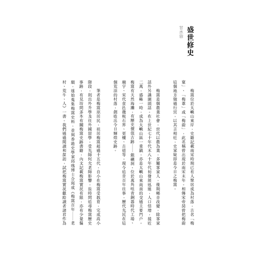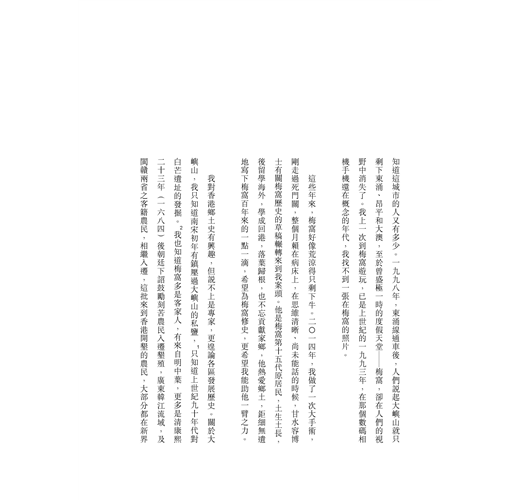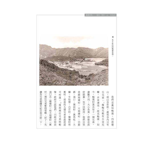 這些年來,梅窩好像荒涼得只剩下牛。二〇一四年,我做了一次大手術,剛走過死門關,整個月賴在病床上,在思維清晰、尚未能話的時候,甘水容博士有關梅窩歷史的草稿輾轉來到我案頭。他是梅窩第十五代原居民,土生土長,後留學海外,學成回港,落葉歸根,也不忘貢獻家鄉,他熱愛鄉土,鉅細無遺地寫下梅窩百年來的一點一滴,希望為梅窩修史,更希望我能助他一臂之力。