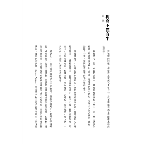本書兩位作者,從故老相傳的故事出發,結合史料、訪問和數十年的生活經驗,用一個不同於一般的視點,把數百年歷史的老村、被人類用完即棄的牛群,以及來自四方定居梅窩的人,點點滴滴一一道來。