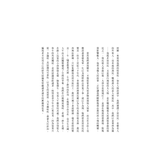 當然我們書寫歷史,不僅需要多角度多側面描寫人與事,而且在方法上也應該盡量避免單一化以及純粹給出答案了事。就以牛為例,牠們曾是原居民的寶貝,但自上世紀六十年代,香港政府將農民賴以為生的水源引進水庫,農民再無法耕種,只好集體移民到市區打工,農村只剩下老弱婦孺,還有曾經的寶貝──牛。隨着農業式微,牛沒了耕田的作用,在梅窩自由自在,也自生自滅,人牛由互助關係變成了空間的爭奪,我們在白銀鄉採風時,看過一群牛走過,在路上玩耍的小孩紛紛走避,險象環生。究竟人牛應如何共處?我們分別從人和牛的角度闡述,並把結論留給讀者,特別是青少年自己來思考。因為如果只從一方論述,其結論的可靠性,以及它的延展度,乃至趣味性,都會大打折扣。編寫者不宜用自己的研究結論來窒礙讀者讀史的興趣與思考。