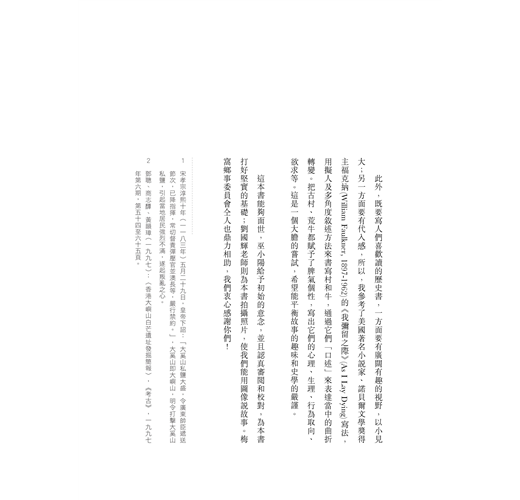 此外,既要寫人們喜歡讀的歷史書,一方面要有廣闊有趣的視野,以小見大;另一方面要有代入感,所以,我參考了美國著名小說家、諾貝爾文學獎得主福克納(William Faulkner, 1897-1962)的《我彌留之際》(As I Lay Dying)寫法,用擬人及多角度敘述方法來書寫村和牛,通過它們「口述」來表達當中的曲折轉變。把古村、荒牛都賦予了脾氣個性,寫出它們的心理、生理、行為取向、欲求等。這是一個大膽的嘗試,希望能平衡故事的趣味和史學的嚴謹。