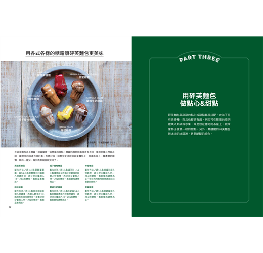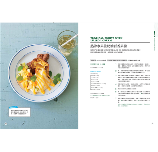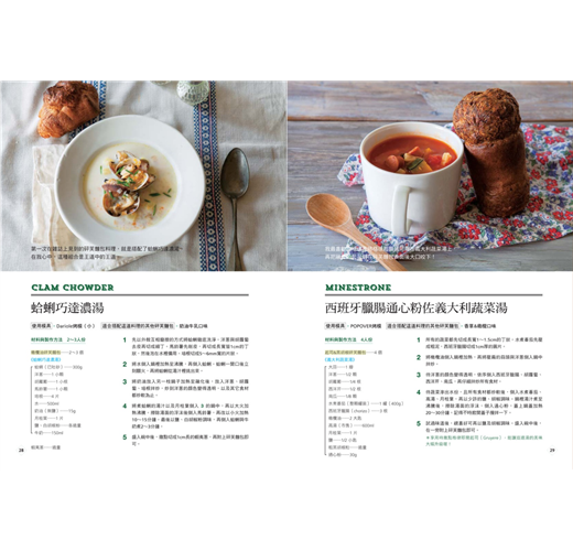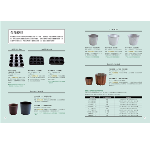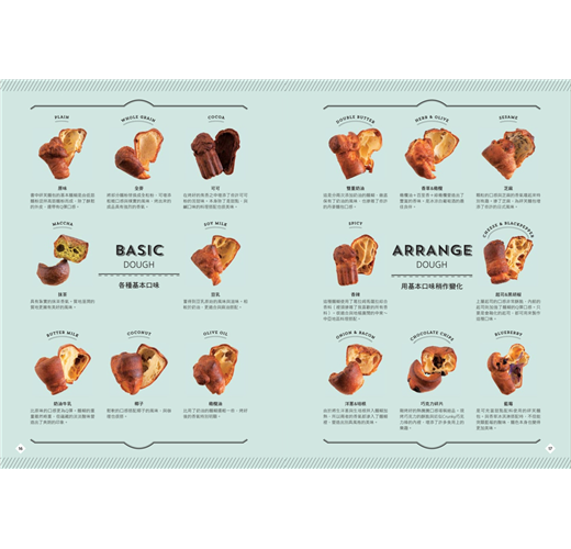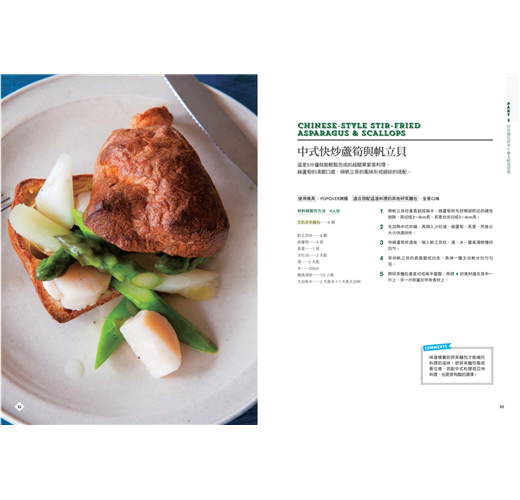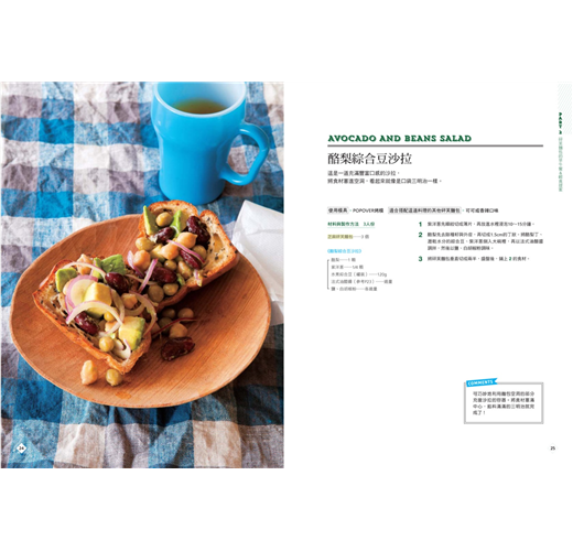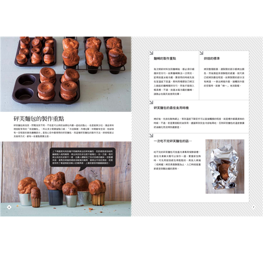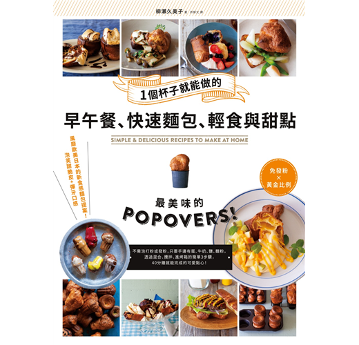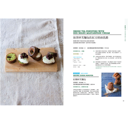 只要有雞蛋、牛奶、麵粉、奶油、鹽,就能做出最基本的POPOVERS,而且不需添加發粉、泡打粉、酵母等膨脹劑,也能烤出大人小孩都喜愛的鬆軟口感,根據不同口味變化,書中對於材料比例跟步驟都有清楚的說明。