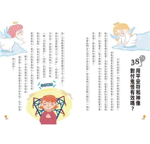 平安符就像是一個可以發射保護能量的裝置,神像則像是能夠發射保護能量的基地臺,可是這兩樣物品也都需要補充能量,否則無法保護我們。就像是給玩具裝了沒電的電池,玩具還是一樣不會動的。所以平安符和神像必須有保護能量才會有效果,那麼要如何補充呢?其實我們自己就可以產生能量,因為每個人的肩膀上都住了一個天使,只要眼睛閉起來向右邊肩膀念三次「平安」,再往左邊肩膀念三次「平安」,然後往兩手吹氣,再把雙手放在胸口,就會升起一圈「平安保護罩」,這樣一來鬼怪就不敢靠近我們。