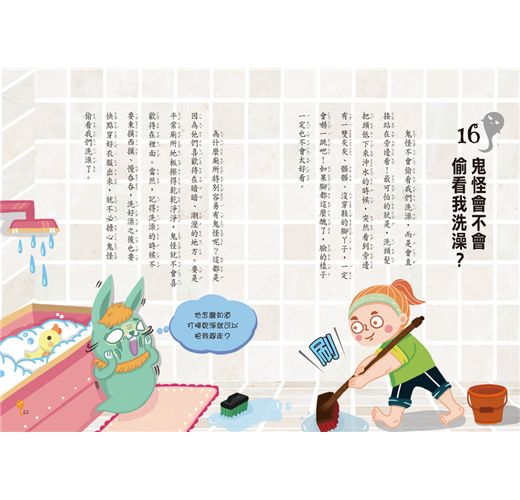 為什麼廁所特別容易有鬼怪呢?這都是因為他們喜歡待在暗暗、潮溼的地方。要是平常廁所地板擦得乾乾淨淨,鬼怪就不會喜歡待在裡面。當然,記得洗澡的時候不要東摸西摸、慢吞吞,洗好澡之後也要快點穿好衣服出來,就不必擔心鬼怪偷看我們洗澡了。