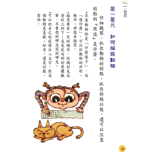 1.藉由「一段話」、「認識句子」、「認識語詞」、「文章導引」,循序漸進的讓孩子奠定寫作的基礎。