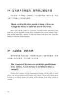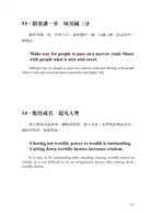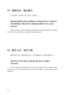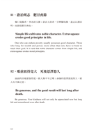 若將「君子」譯為“gentleman”那麼很明顯的將婦女排除在外了。古希臘人認為,一個能夠充分發展人性與才能的人,才是一個真正完整的人,也就是“a real person”。洪應明則認為,一個人若能回歸天賦本性,不做欲望的奴隸,就是一個天人合一真正的君子人。天賦的本性就是人性。兩者的用語雖然不同,含義卻是一樣的。因此翻譯「君子」二字時,就借用古希臘人的用語,稱一個天人合一的人為“a real person”。但「君子」二字在《菜根譚》中並不是永遠稱呼天人合一的人,所以遇到不同情況時,就分別譯為“an enlightened person”,“a real person”,“the virtuous”等等沒有性別區分的中性字詞。舉第四十二條及第九十五條為例。