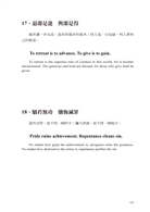名詞必需解釋才能讓譯文讀者瞭解,但將解釋溶在行文裡又有困難的時候,就用文後注解的方式說明。舉第六十三條為例,文中提到的欹器」,現今已經失傳了,所以先音譯,再用文後註解的方式,將它介紹給譯文讀者。