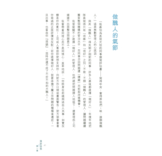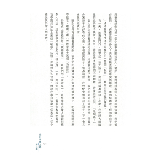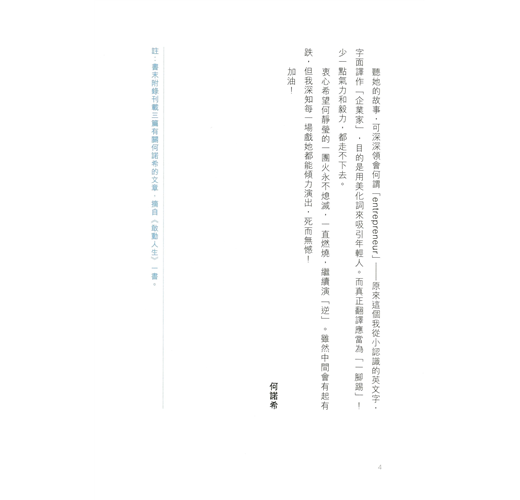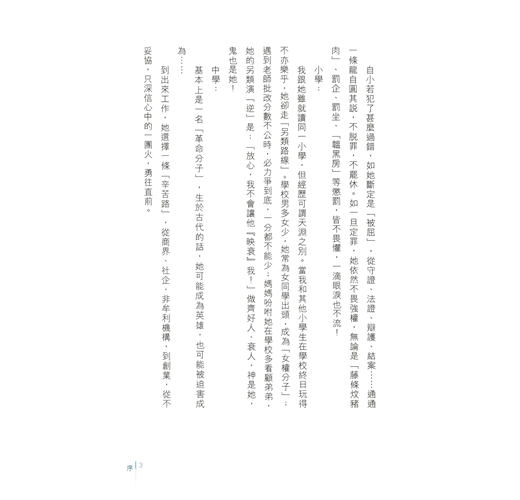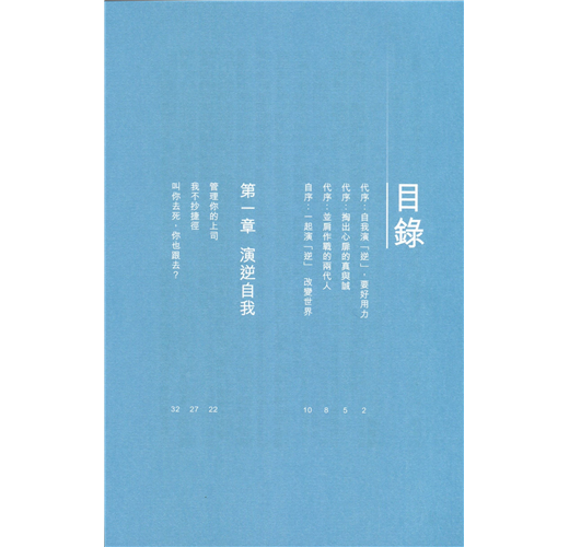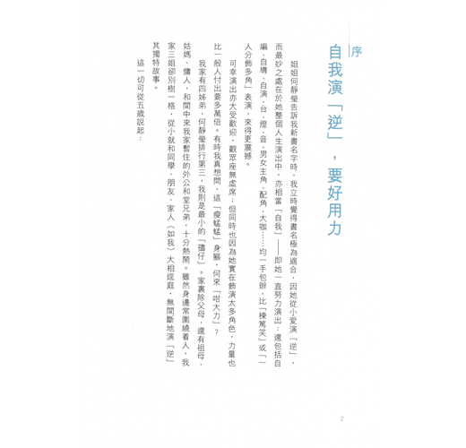 書中有不少揭露作者自身軟弱、掙扎和黑暗面的篇幅,這不是為了以退為進或博同情,乃是要呈現一個人必先要對自己有所批判和鞭策,才能演「逆」其人生。
