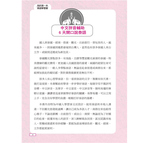 本書內容特為全球華人學習泰文而設計,能用泰話和本地人溝通,不但觀光旅遊能盡興,讓自己成為多語人才,商務往來也能得心應手。不論是跟團、自助旅行,或洽公、商貿,無論是何種目的赴泰,能懂當地人的語言,深入瞭解風俗民情,甚至認識當地人,那種成就感和奇妙經驗,都能為旅途增添色彩,觀光、經商、工作都能更便利。
