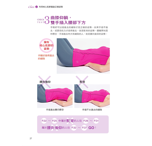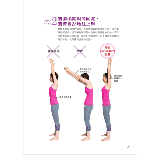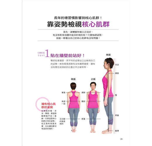 鍛鍊核心肌群的肌肉是從正確的姿勢開始。身體之所以無法保持正確的姿勢,是核心肌群衰弱的緣故。所以第一步要先檢查自己的姿勢正不正確,再替使用過度的肌肉做伸展操,一邊意識著衰弱的肌肉一邊進行鍛鍊,藉以調整核心肌群的平衡。