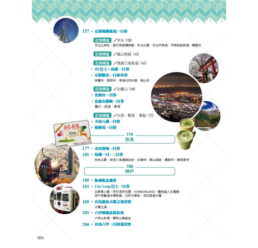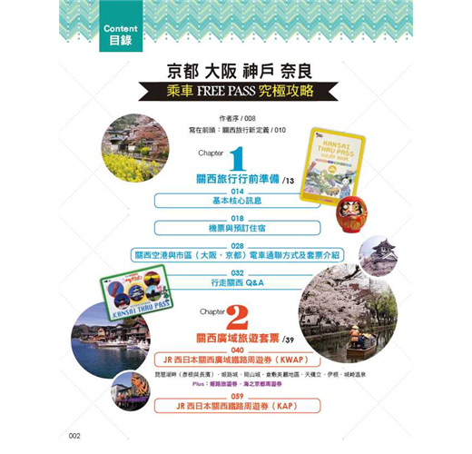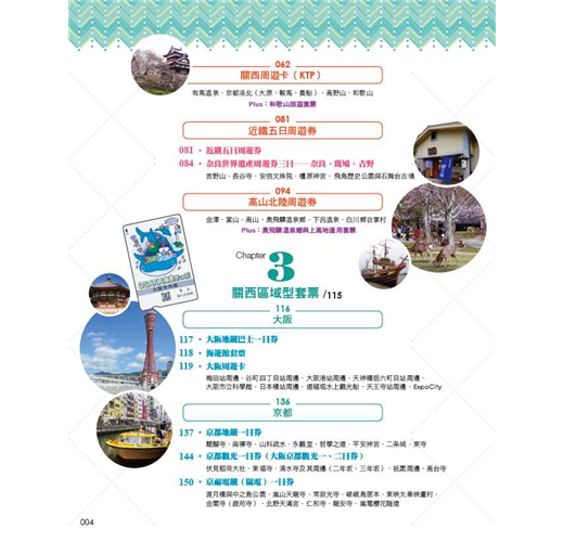 大至串連關西各府縣聯遊的廣域套票、由關西出發前往高山北陸的優惠票券,小至關西主要城市京都、大阪、神戶、奈良的地區型套票,作者玩過才敢推薦,而以往因交通費昂貴而令人卻步的優質景區也可一網打盡,一券在手、自由遊走。
