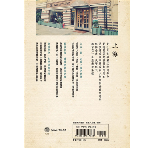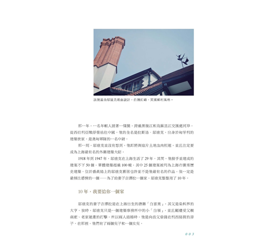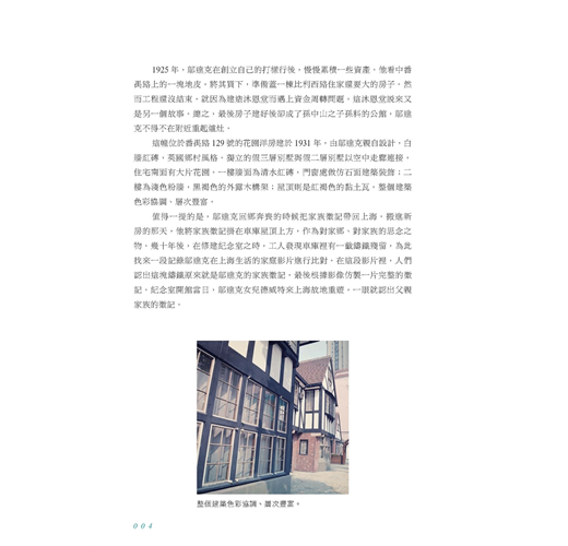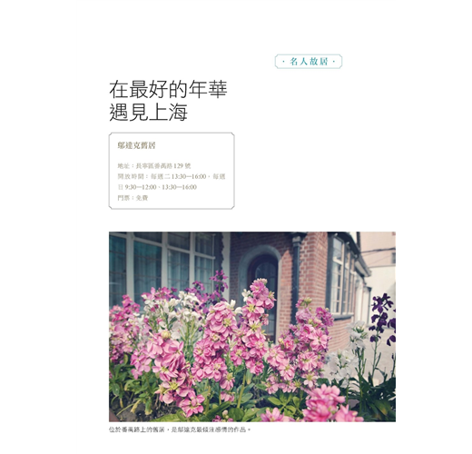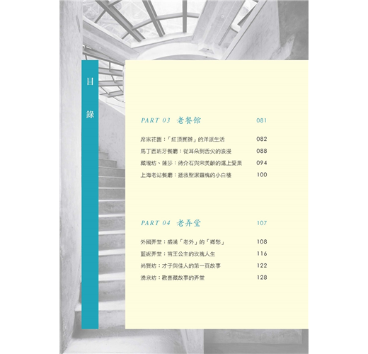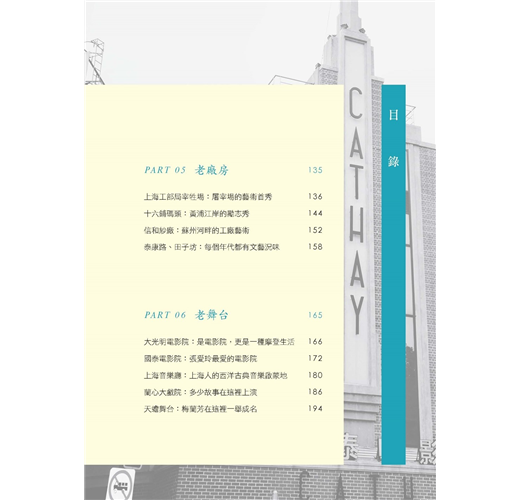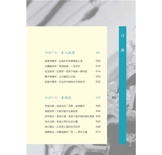 分成名人故居、酒店、餐館、弄堂、舞台等主題,介紹29處必訪老屋,從中感受到民國初年上海絕頂風華