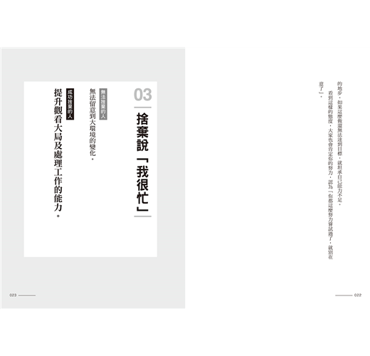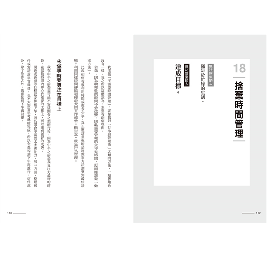 沒有結論也沒有意義的會議、只會抱怨而沒有實質行動的喝酒聚餐、媽媽們東家長西家短的聊天聚會、社群網站上自我滿足的發表、沒有必要的貼圖或簡訊往來、充滿無用訊息的八卦節目、到了隔天連頭條新聞都不記得的報紙閱讀…… 從這些「不知不覺就這麼做」的習慣中,清楚區分哪些事真正值得自己花時間去做,不需要的就乾脆直接捨棄吧。