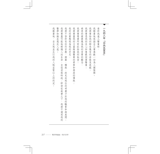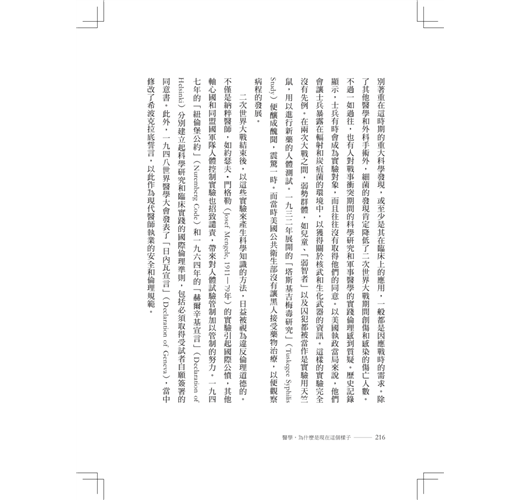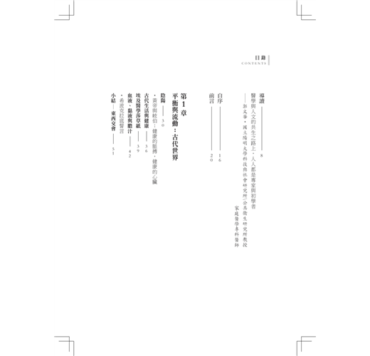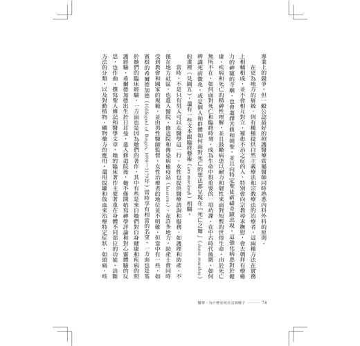 翻譯則是本書的另一大挑戰。本來通史涵蓋上下古今,內容不易掌握,加上作者引入醫學史的研究成果,信手拈來固然舉重若輕,但翻譯者如何得其要旨,將傳統醫學史裡不會觸及的人物與文獻介紹給讀者,在在需要功夫。對此,翻譯者的努力值得肯定。以醫學教育重視的「醫師誓詞」(Oath of Hippocrates)來說,目前流傳的大多不是希波克拉全集的版本(是1948年世界醫學大會的宣言,見頁211),而維基百科的文言文翻譯又拮据聱牙。相較於此,本書的翻譯直接明朗(頁36-37),可讀性較高。另外,《黃帝內經》的論脈象段落(頁24)出自「平人氣象論」,翻譯者加以還原,給讀者更多思索空間。比方說,原典的「心平」原文將其翻譯成英文「healthy heart」,翻回中文後,兩相對照,讀者可以思考中文的「平」是否等同英文的「healthy」,反省異文化對於健康的不同詮釋。