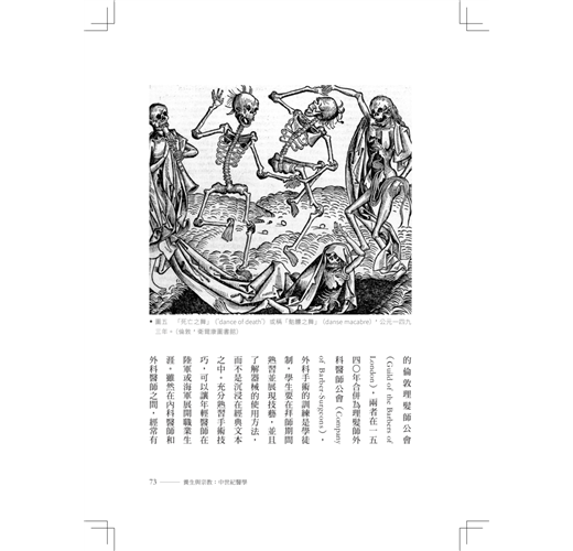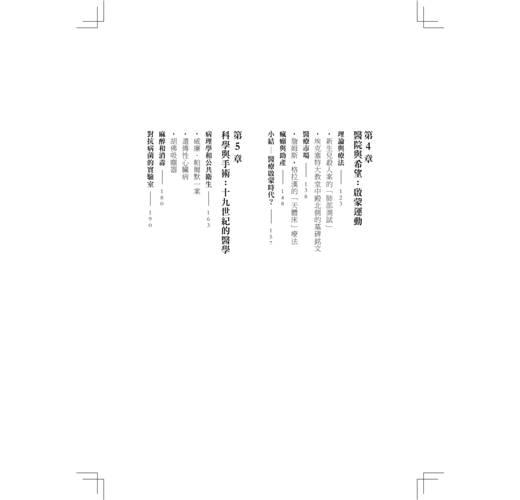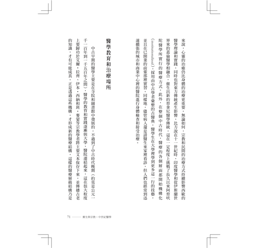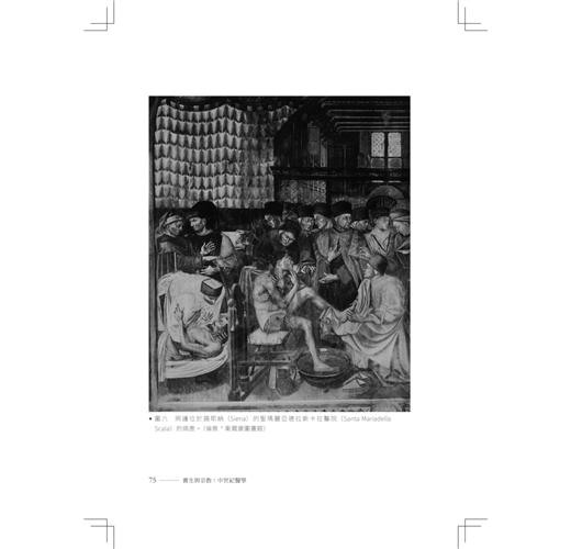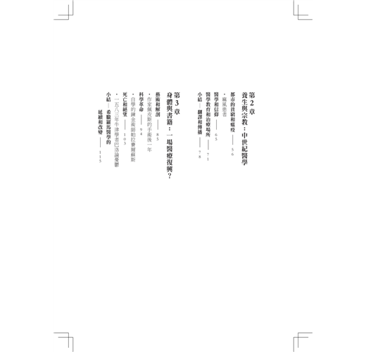舉其要者。第一章裡不但有醫學生熟悉的希波克拉底與希臘醫學,也有東亞醫學與印度阿育吠陀醫學(Ayurvedic medicine),呈現古人探求生命與身體關連的共通性與差異性。而作為「醫學傳統」,非西方醫療並非就此為止。之後各章作者適當穿插相關內容,顯示這些「另類」治療在各時代的演變。在古典醫學建立後,第二章的中古時期雖然肯定醫療活動的遍地開花,但也提醒讀者這段期間一般人對於疾病的認知與宗教的深遠影響,因為「對許多人來說,心靈的治癒仍比身體的治療更重要」(頁63)。闡述「醫療復興」的第三章固然含括如哈維的血液循環實驗等重要發現,但作者將主軸放在知識傳遞,將醫學放回文藝復興的脈絡,與前一章的跨文化知識傳播與翻譯相互銜接。同樣的,在頌揚科學革命之餘,作者點出中古與文藝復興時期在社會文化上的連續性。一方面宗教依舊影響疾病的解釋,一方面世俗醫療活潑進行,與解剖知識的進展互不干涉。
