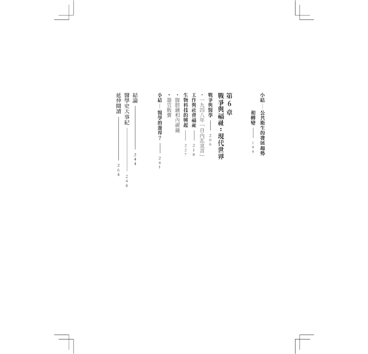 作為醫療實作的場域,醫院在台灣醫學史中不是核心課題,但第四章以此為題,讓它成為鋪陳臨床理論、儀器與醫療市場的環節,間接但有力地回應「真的有所謂『啟蒙醫學』的存在嗎」的大哉問。醫學通史固然不能迴避十九世紀科學醫學與醫療產業的興起,但第五章在眾多人物與醫學進展間編入社會議題,像人體買賣、職業衛生、慢性病經驗、公共衛生與清潔用品等,讓第六章從戰爭與福祉(war and welfare)轉進醫療體制時毫不突兀。最後作者以戰爭的比喻點出當代醫療的矛盾與困境。他同意醫學不會新疾病的出現就放棄創新,但他提醒讀者固然「可以期待『醫學史上出現新的篇章』,但這一章裡可能充滿種種疾病,就跟之前的幾章一樣;只是疾病的種類和過去的有所不同而已」(頁238)。
