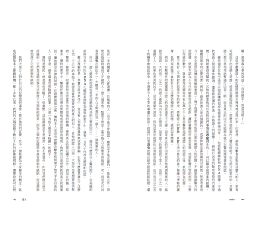 本書從心理學與神經科學的跨域視野,經由多宗確鑿的冤案分析,批判司法錯誤所造成的判決不正義,質疑「我們的司法制度有足夠的彈性可以回應神經科學的新發展嗎?」這不單是美國司法要面對的問題,凡是以「人」為主體參與法庭活動的司法制度,都無可迴避「人性與心理」的共通問題。作者巧思以心理學、神經科學、法學的不同專業領域的知識為「經」,再以受害人、嫌疑人、證人、專家、律師、檢警、法官各種訴訟程序中的角色為「緯」,穿梭交織成一幅冤案地圖,照見隱藏於案件卷宗的錯誤因子,使之無所遁形,深具啟示意義。"